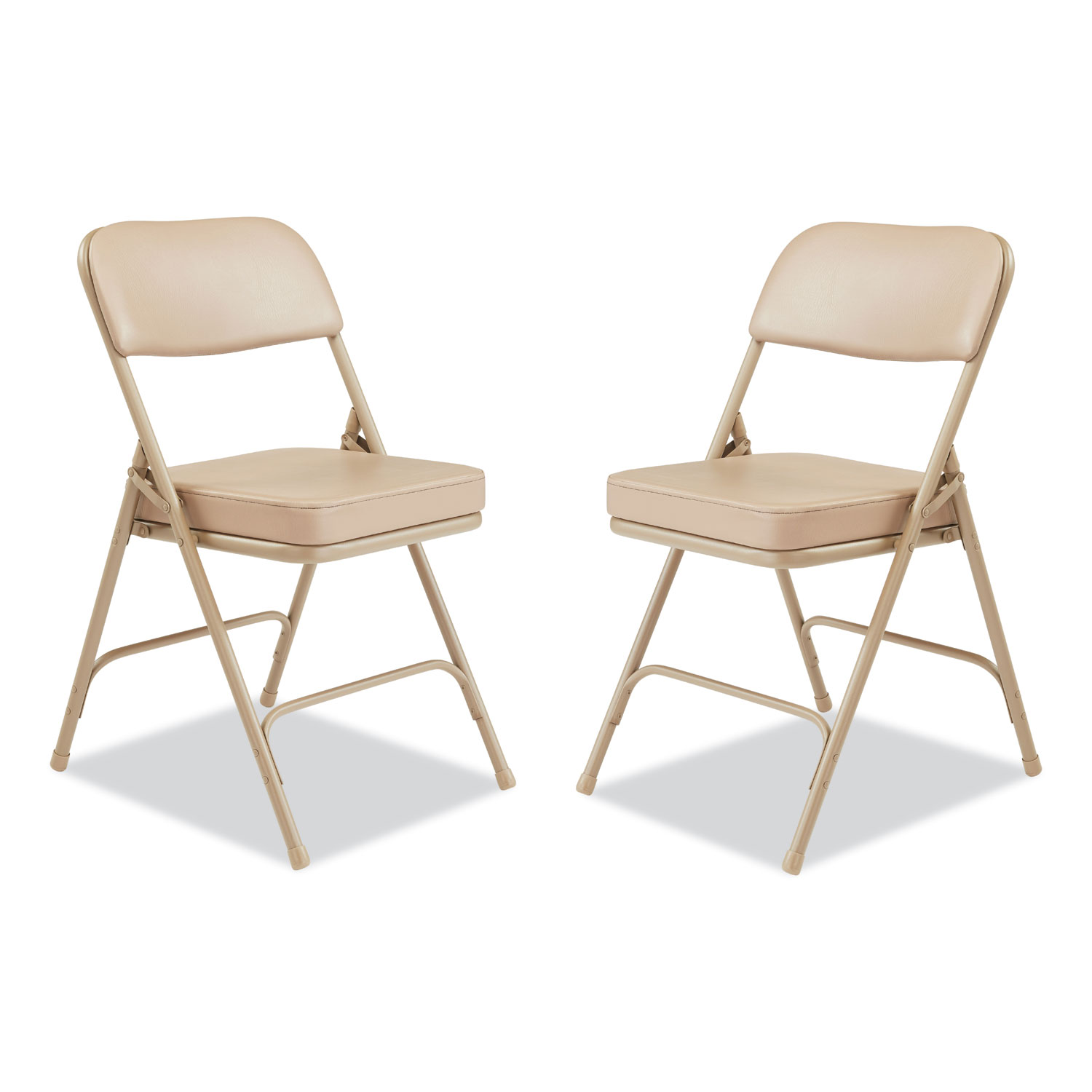 NPS® vinyl padded double hinge folding chairs feature a super-soft 2 inch thick cushion providing comfort and relaxation. These chairs are a perfect solution for dining, meetings and banquets. Matching chair glides prevent floor damage. Recommended Application Area(s): Breakroom & Foodservice; Classroom & Training; Conference & Meeting; Guest/Reception & Lounge; Seat Color: Beige; Back Color: Beige; Color Family: Beige.