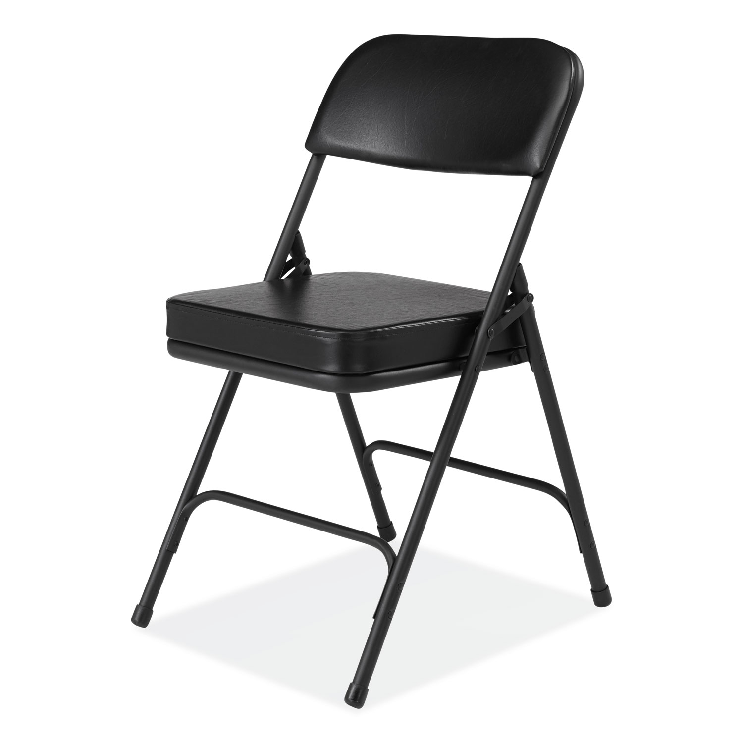 NPS® vinyl padded double hinge folding chairs feature a super-soft 2 inch thick cushion providing comfort and relaxation. These chairs are a perfect solution for dining, meetings and banquets. Matching chair glides prevent floor damage. Recommended Application Area(s): Breakroom & Foodservice; Classroom & Training; Conference & Meeting; Guest/Reception & Lounge; Seat Color: Black; Back Color: Black; Color Family: Black.