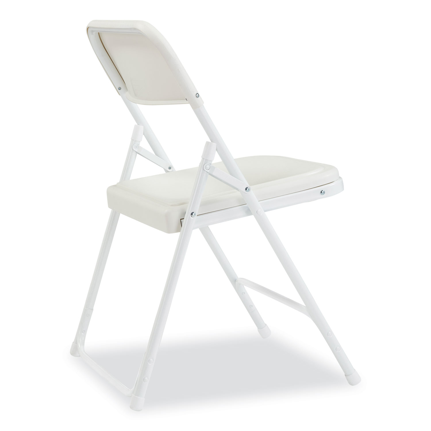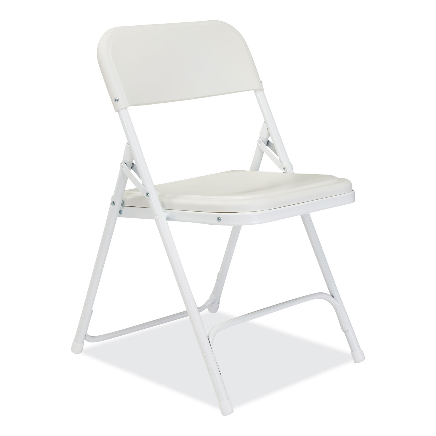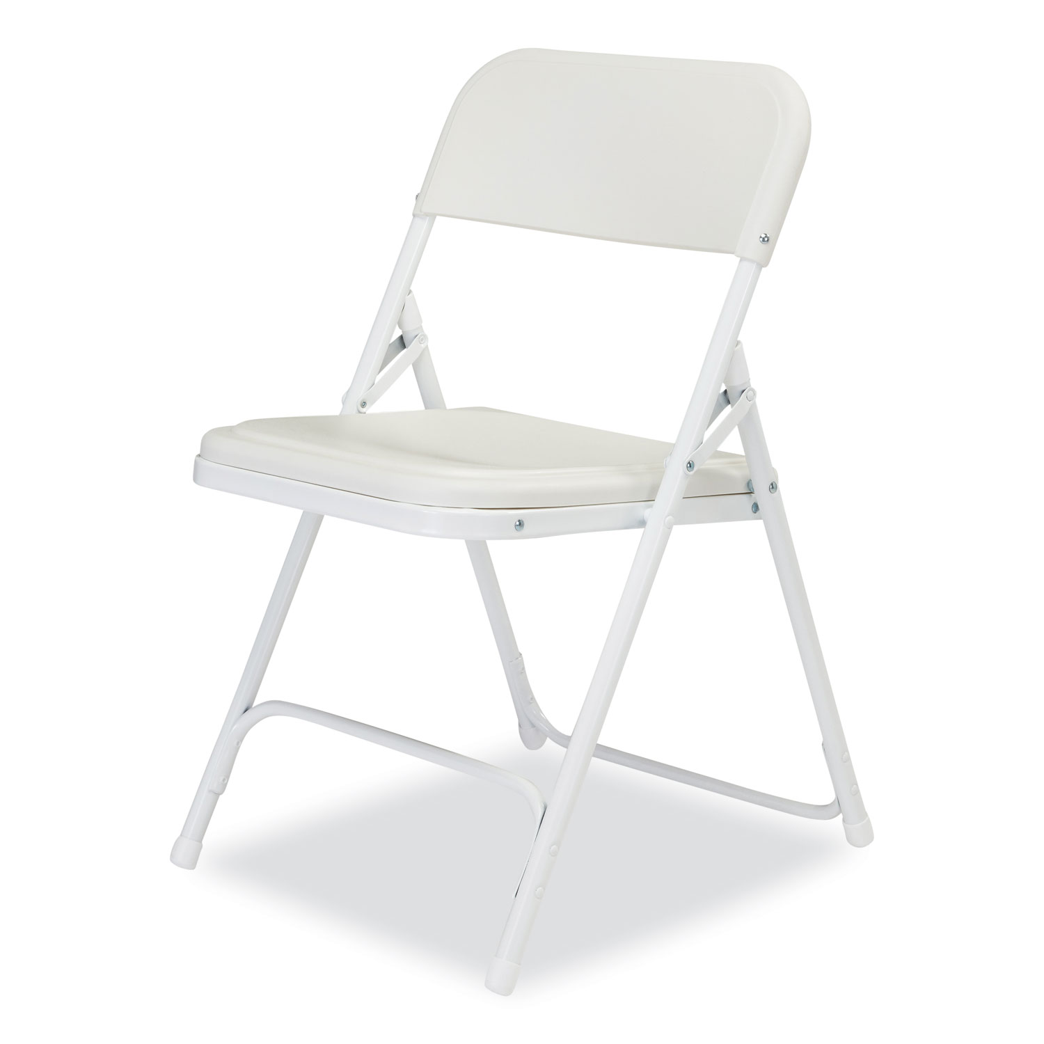 The 800 Series folding chair offers the perfect solution for both indoor and outdoor seating events such as meetings, graduations and receptions. This lightweight institutional-grade chair was made to provide you with the strengths of metal and all the benefits of plastic. The powder-coated 18-gauge tubular steel frame features two double-riveted U-braces—one in front and one in back— to securely support the double-hinged legs. The large seat and backrest are made of comfortable contoured color-impregnated plastic to prevent fading and rusting. Color-coordinated V-tip stability plugs provide added reinforcement at the frame's junction and matching replaceable glides prevent floor damage. Recommended Application Area(s): Breakroom & Foodservice; Classroom & Training; Conference & Meeting; Guest/Reception & Lounge; Seat Color: Bright White; Back Color: Bright White; Color Family: White.