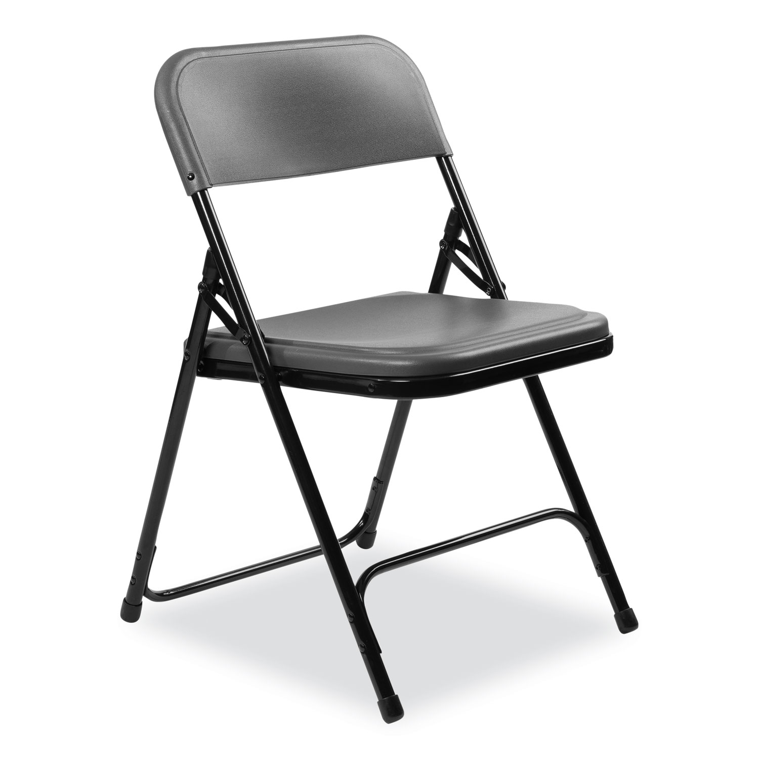 The 800 Series folding chair offers the perfect solution for both indoor and outdoor seating events such as meetings, graduations and receptions. This lightweight institutional-grade chair was made to provide you with the strengths of metal and all the benefits of plastic. The powder-coated 18-gauge tubular steel frame features two double-riveted U-braces—one in front and one in back— to securely support the double-hinged legs. The large seat and backrest are made of comfortable contoured color-impregnated plastic to prevent fading and rusting. Color-coordinated V-tip stability plugs provide added reinforcement at the frame's junction and matching replaceable glides prevent floor damage. Recommended Application Area(s): Breakroom & Foodservice; Classroom & Training; Conference & Meeting; Guest/Reception & Lounge; Seat Color: Charcoal; Back Color: Charcoal; Color Family: Gray.