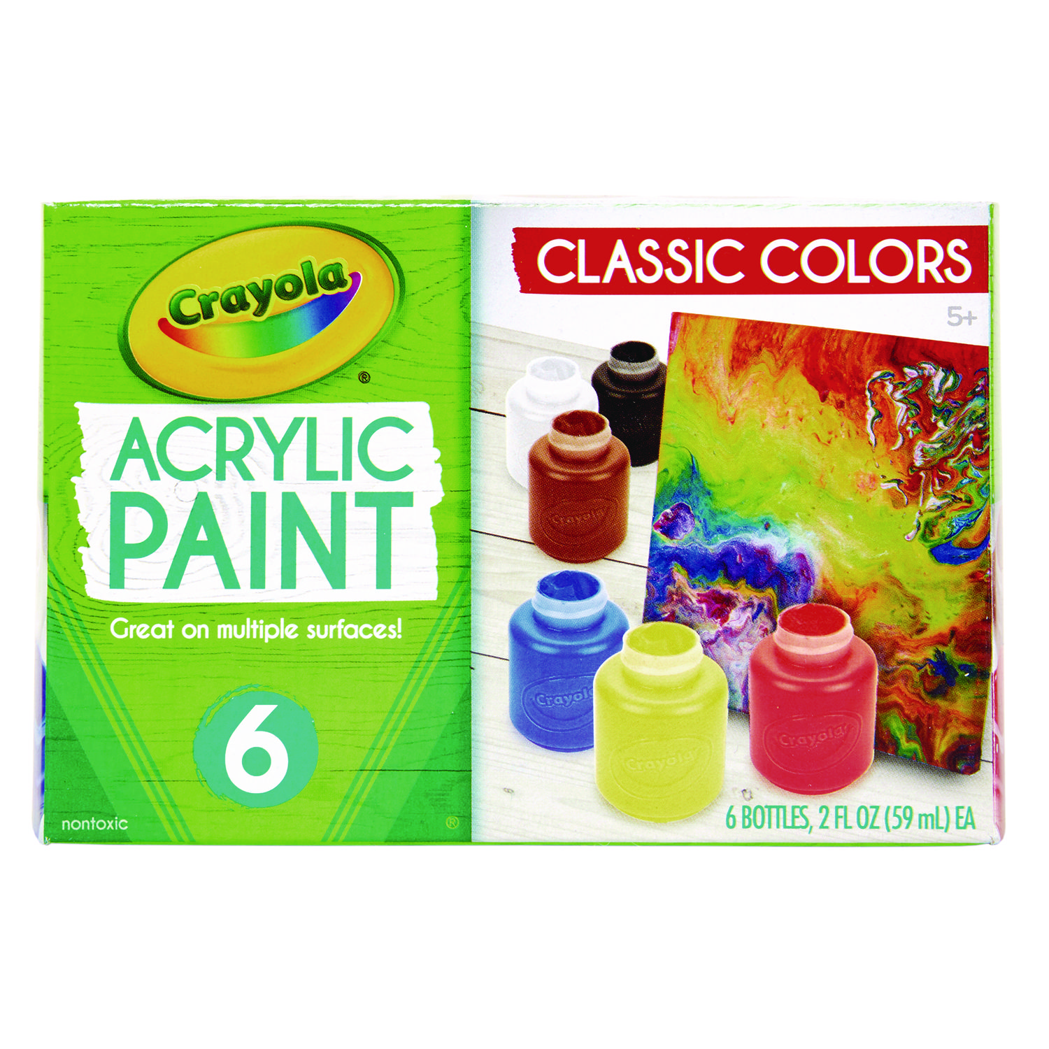 Perfect for arts and crafts at school and at home, Crayola® Acrylic Paint Sets offer pigment-rich colors that are water-resistant and permanent when dry. Thick and rich, this vibrant paint makes possible a wide variety of techniques on surfaces such as canvas, wood, metal, fabrics and ceramics. Though permanent when dry, while wet, the paint cleans up with soap and water. If spilled, be sure to clean-up immediately, before the paint dries. Safe and nontoxic. Paint Sub-Category: Acrylic; Intended Application Environment: Interior; Finish/Sheen: Matte; Color(s): Assorted Classic.