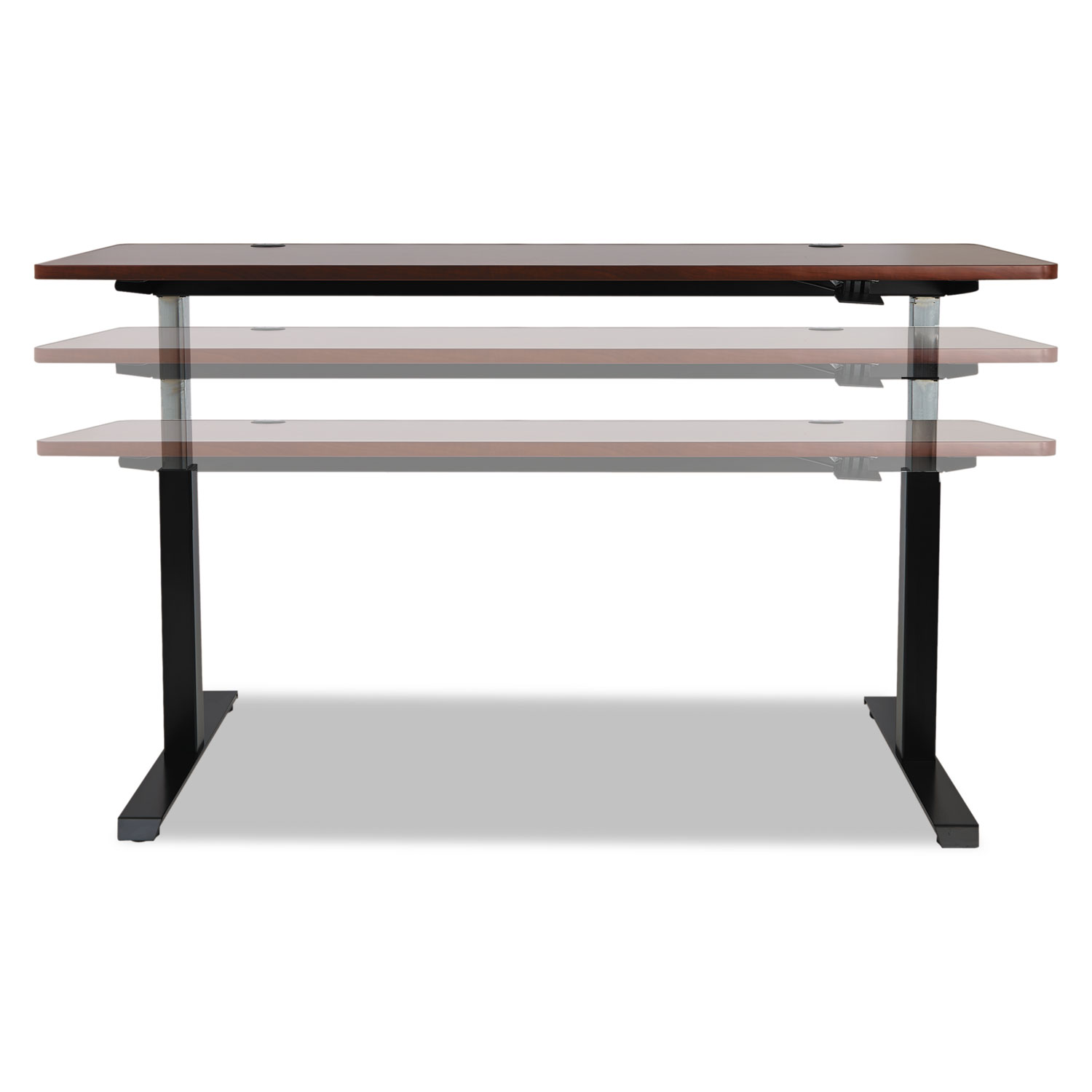 Set the perfect height when sitting or standing. Pneumatic control lift-assist height-adjustable table base. No electricity needed. Durable base recommended for up to 85 lb lift capacity including weight of worksurface. Movement within a 13" range from 26 1/4" to 39 5/8". Accommodates most common worksurfaces ranging from 59" to 72" width; and 24" to 30" depth. Strong black powder coated steel frame with cross bars provides stability and prevents racking. Adjustable leveling glides to compensate for uneven floors.