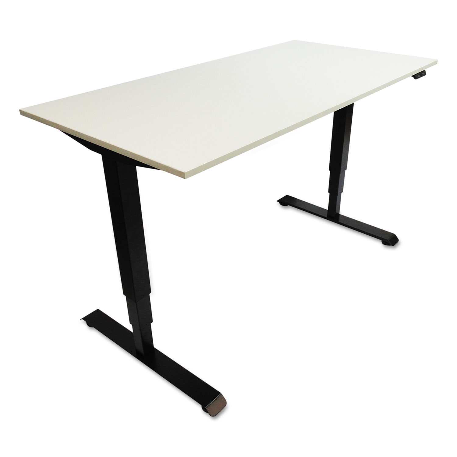 Set the perfect height when sitting or standing. Three-stage reversed-telescoping electric height-adjustable table base with four-memory presets and up and down controls. Quick setup with fold-out legs requires minimal assembly. Durable base with 285 lb lift capacity moves within a 25" range from 25" to 50" (not including worksurface). Attaches to most common worksurfaces ranging from 48" to 75" width; and 24" to 36" depth. Integrated cable management channels; includes 9.8 ft power cord. Dual motors with movement up to 1.5 inches per second depending on load. Strong powder coated steel frame with cross bars provides stability and prevents racking. Adjustable leveling glides to compensate for uneven floors.