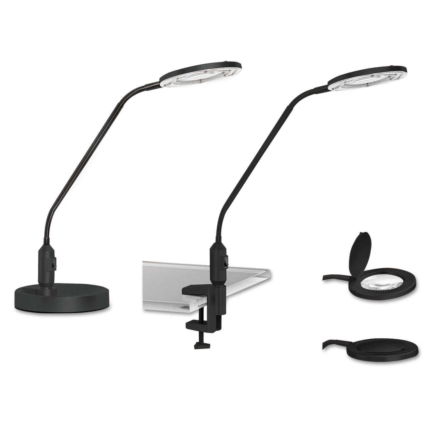 The 3-diopter acrylic magnifier lens enlarges 1.75 times. Magnifier lens includes built-in high power 5-diopter mini lens for additional magnification to see small details and fine print with greater comfort and ease. Versatile design includes interchangeable desk base and mounting clamp. Metal arm features gooseneck joints at base and shade for maximum flexibility in positioning. On/off switch conveniently located on base of arm. The 6 3/4" round desk base features recessed design for holding clips, coins and other sundries. Surface-mount, 5.4 watt LEDs have an average rated life of 20,000 hours. Flip up lens cover protects magnifier lens from dust and scratches when not in use. AC adapter includes 70" long cord.