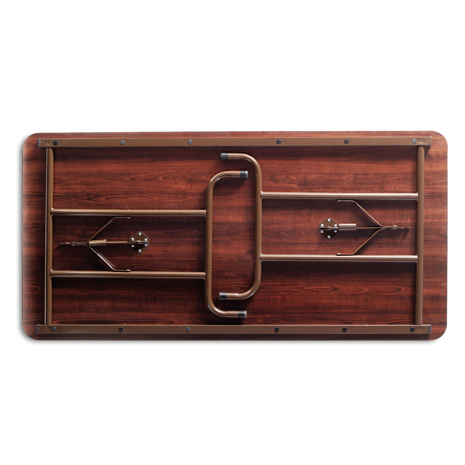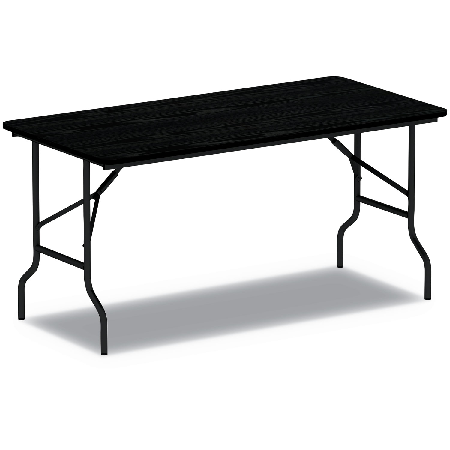 Folding table with scratch-resistant melamine top that is 0.63" thick with a one-piece, 1.75" steel apron and protective edging. Fully finished laminate on top and underside to prevent warping. Laminate is scratch, dent, and water-resistant for long-lasting use. The gravity leg-locking mechanism makes set-up quick and easy. Folds to 2.5" thick and locks for easy transport and storage. 1" diameter, steel legs have plastic foot caps to protect floors. Holds up to 1,200 lbs of evenly distributed weight.