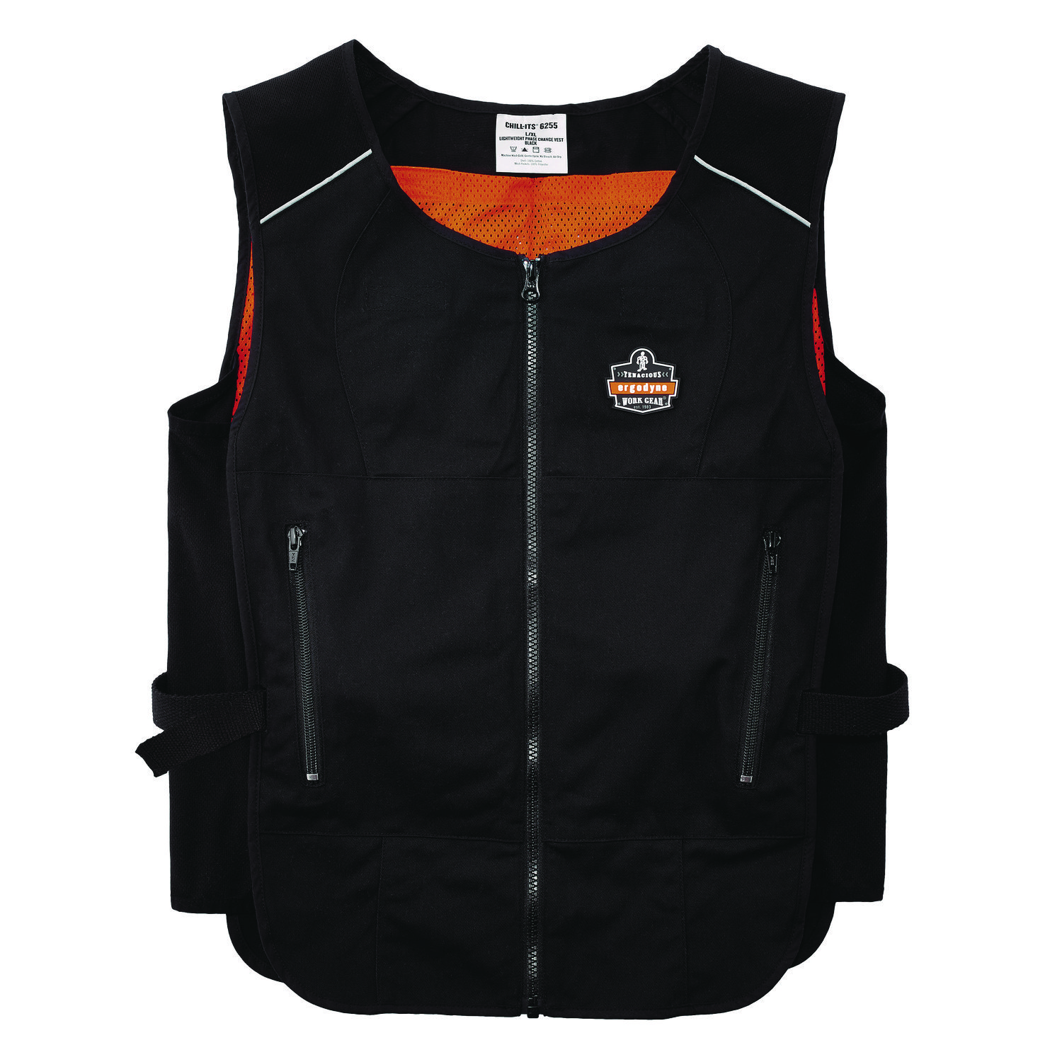 The Chill-Its Lightweight Phase Change Cooling Vest helps to keep workers cooler, safer and more productive. Its phase change cooling material maintains a 64°F/18°C temperature for up to two hours when activated. The vest's adjustable hook and loop closures around the waist provide a customized fit for different body types. The heavy-duty front zipper makes for easy on/off, while the two front zippered pockets can be used to store small accessories. Phase Change Cooling Packs not included. There are many ways to activate your cooling vest. Simply place the four removable packs in a cooler of ice water for five minutes; freezer for eight minutes; refrigerator for 12 minutes; or near an air conditioner for one hour. The cooling pack should be washed by hand with a mild detergent and warm water. Do not machine wash or machine dry. The fabric vest is machine washable with mild soap. Apparel Type: Cooling Vest; Material(s): Cotton; Polyester; Color(s): Black; Color Family: Black.