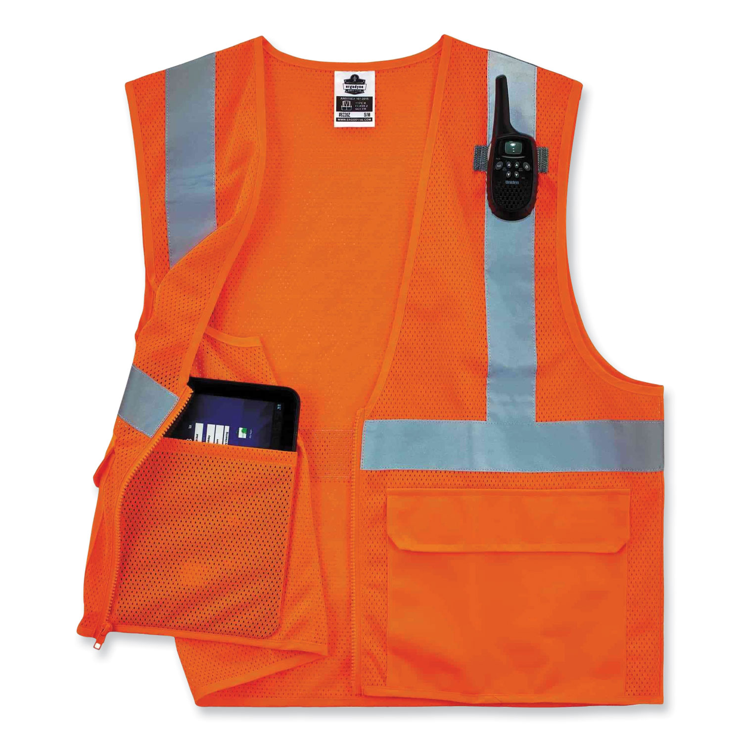 Class 2 standard vest with mesh fabric and zipper closure. 2" ANSI-compliant reflective. One inside, two outside pockets. Single radio mic tab. Apparel Type: Safety Vest; Material(s): Polyester; Color(s): Orange; Color Family: Orange.