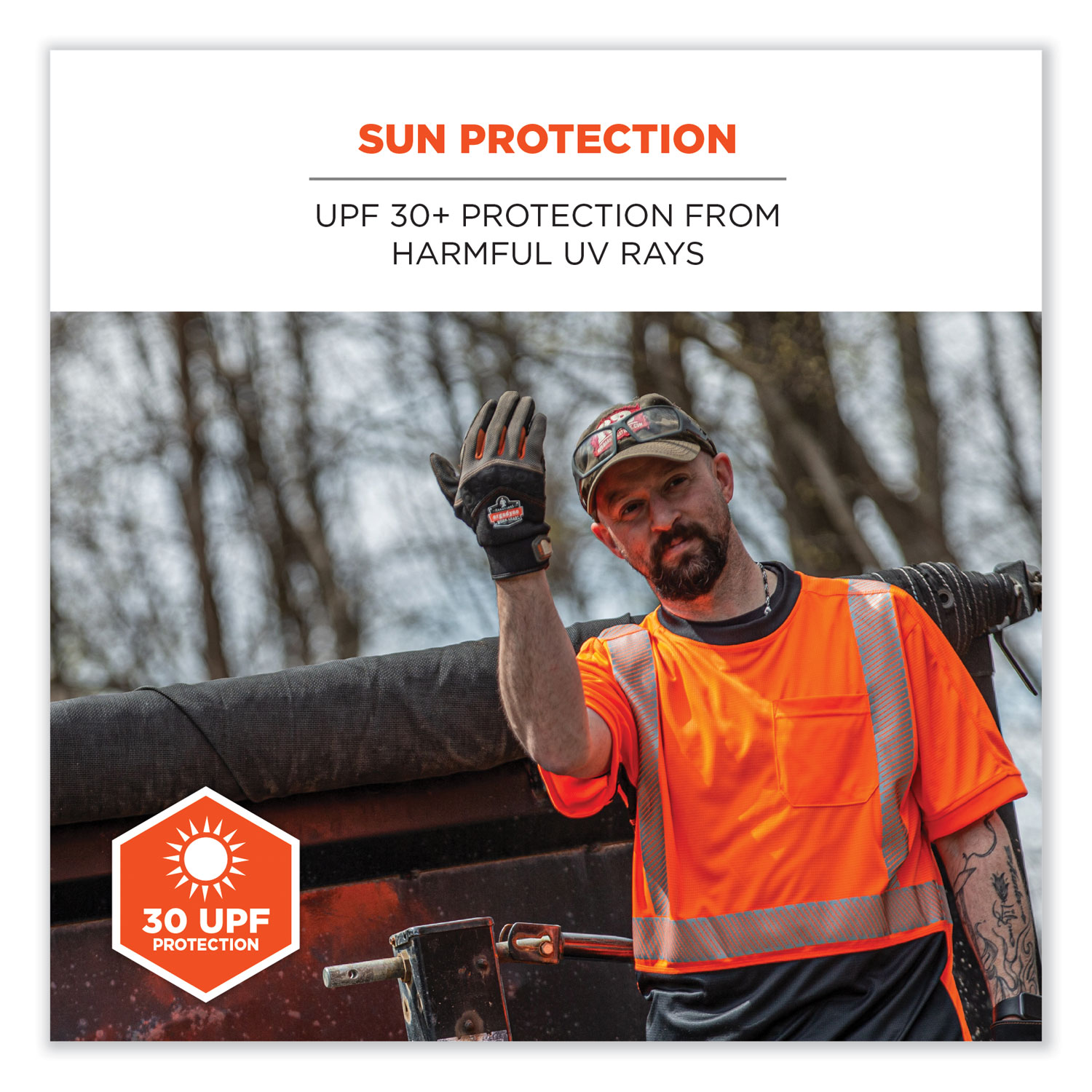The GloWear 8283BK Lightweight Performance Hi-Vis T-Shirt is a Type R Class 2 shirt designed for enhanced visibility and breathable comfort. With an extra soft, jersey-like feel, this 100% polyester fabric is the lightest weight ANSI 107-approved fabric on the market. Great for working in the heat, this reflective safety shirt features a moisture-wicking treatment and underarm vents to keep wearers cool and dry. It is rated to 30+ UPF for protection against the sun's harmful UV rays. The black panel across the bottom hides dirt, grit and dust to keep the shirt looking cleaner longer. Additionally, black vented underarm panels hide sweat and improve breathability. This hi-vis work shirt uses segmented 2" reflective tape for enhanced visibility at night or in low-light conditions. Unlike solid reflective tape, the flexibility of segmented tape allows reflective clothing to feel more comfortable, lightweight and breathable. Apparel Type: Hi-Vis Shirt; Material(s): Polyester; Color(s): Orange; Color Family: Orange.