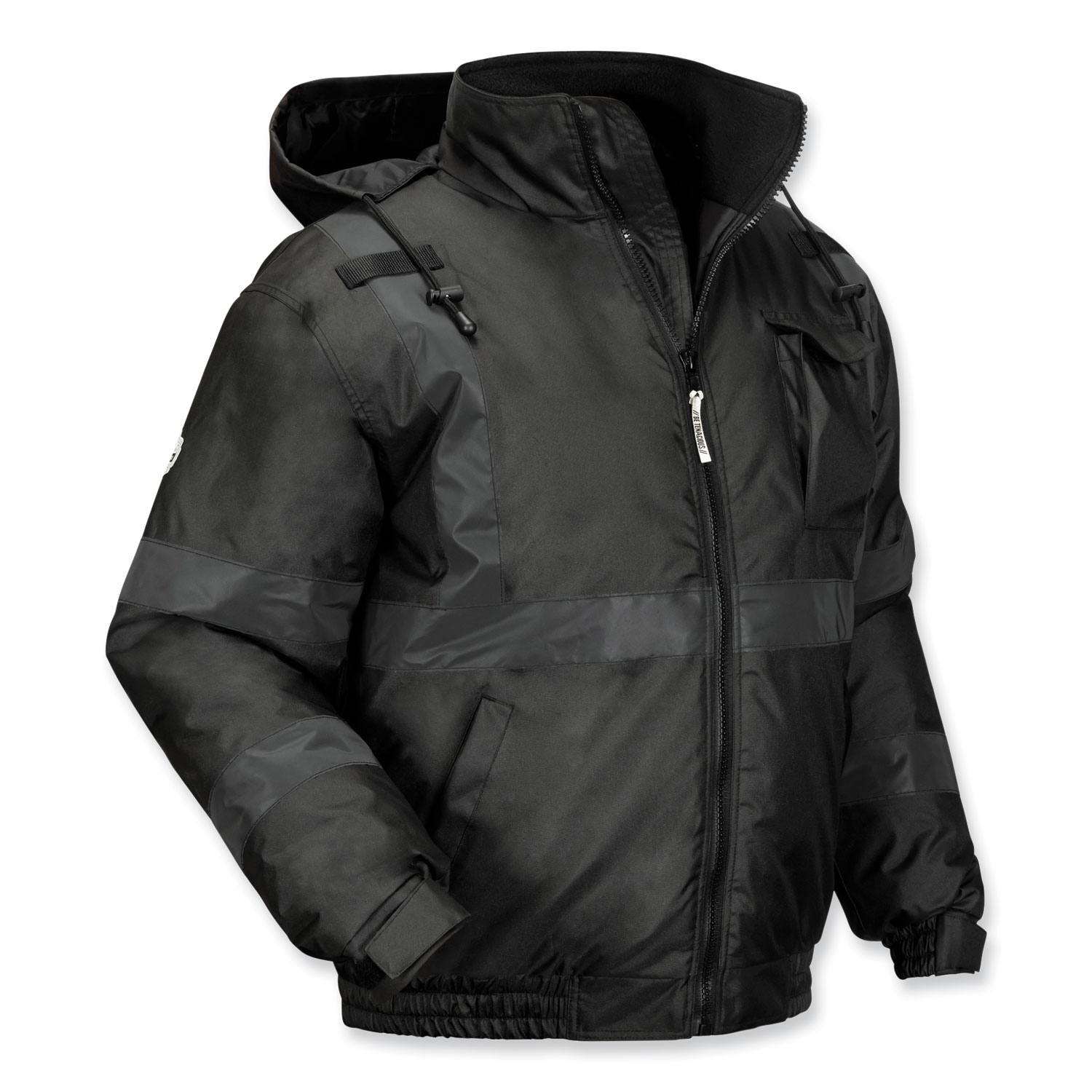 The GloWear 8377EV Thermal Enhanced High Visibility Jacket is designed with a polyester outer shell + PU coating for water- and wind-resistant protection from the elements, plus 160 g thermal quilted insulation for comfortable no-bulk warmth. With unique 2" black reflective tape set on black fabric, this jacket maintains a low-profile look in the daytime while enhancing visibility at night or in low-light conditions. The adjustable inset hood features drawstrings and stoppers for a custom fit, and can easily be zipped in or out depending on weather conditions or personal preference. Adjustable hook and loop cuffs seal out cold and allow for comfortable wear with gloves. A full front zippered closure makes for easy on and off. This work jacket features two lower front pockets, one upper chest cell phone pocket, one dual slot pen pocket and two mic tabs for convenient access and storage. Apparel Type: Hi-Vis Jacket; Material(s): Polyester; Color(s): Black; Color Family: Black.