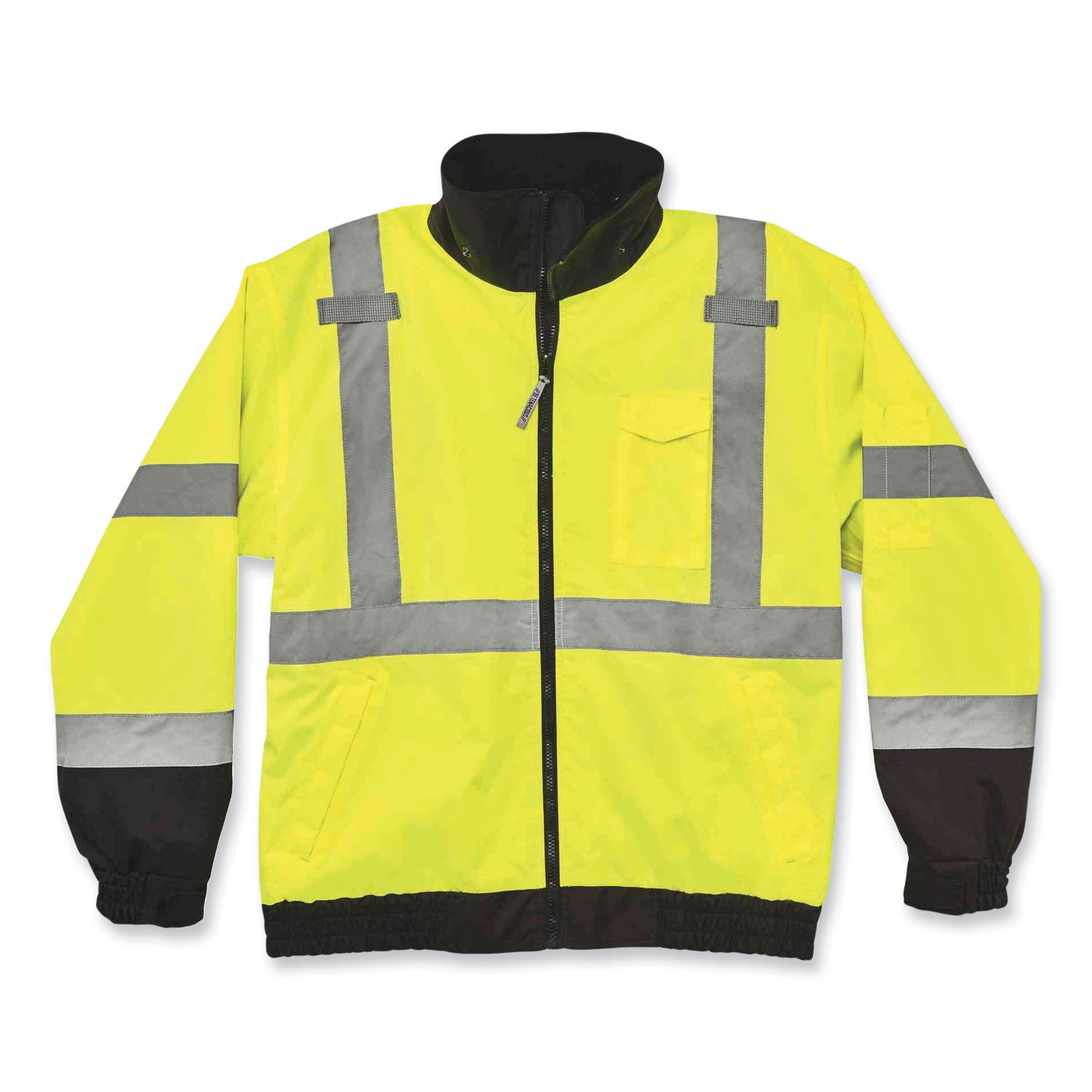 GloWear 8379 Type R Class 3 Fleece-Lined High Visibility Bomber Jacket has a zip-out fleece liner and can be worn three different ways for the ultimate in adaptability for winter workwear. This fleece-lined hi-vis jacket is a Type R Class 3 winter work jacket with 2" ANSI-compliant reflective material for compliance, visibility and warmth at an economical price. This high visibility winter jacket can be worn three different ways: 1) as a jacket with the fleece liner zipped in, 2) fleece liner on its own, or 3) wear the shell on its own for a lightweight, water-resistant outer layer. The weatherproof 300D oxford outer shell with a PU coating resists water and wind to keep you dry and warm. Cuffs feature hook and loop straps to seal out the cold. Featuring two external front pockets. There are two mic tabs located on the upper chest of the jacket. Apparel Type: Hi-Vis Jacket; Material(s): Polyester; Color(s): Lime; Color Family: Green.