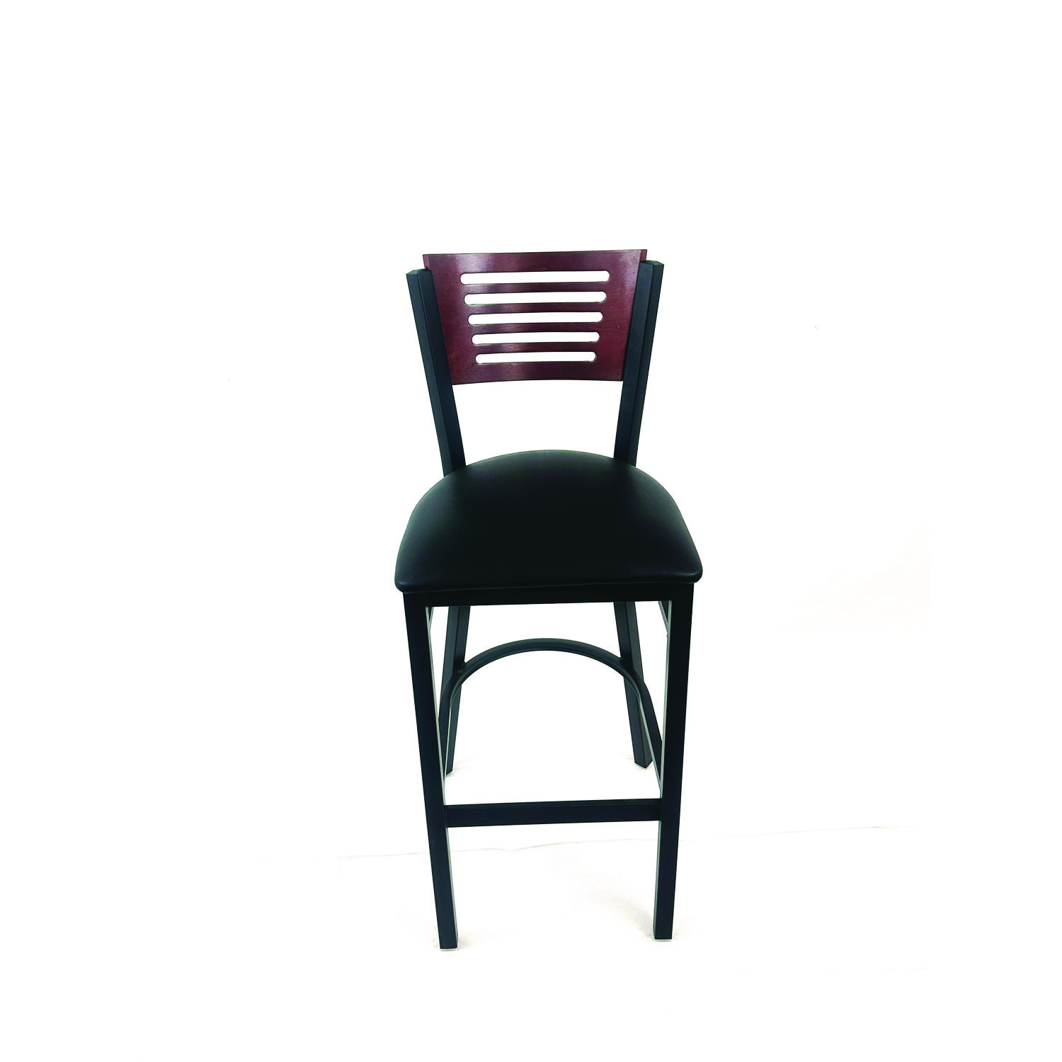 Introducing the perfect seating solution for your home or business-the Jones River Series metal framed barstool with vinyl seat pad. This sleek and modern design is built to provide maximum comfort and durability, all while adding a touch of style to your space. With a sturdy metal frame, this barstool is sure to stand up to even the busiest of environments. The frame is built to last, ensuring that you have a reliable seating option for years to come. The vinyl seat pad is not only comfortable, but also easy to clean and provides a soft and supportive surface that is perfect for extended use making it ideal for high-traffic areas. Whether you're using this barstool in your dining room, kitchen, or bar area, it's sure to impress and is the perfect addition to any indoor space. Recommended Application Area(s): Breakroom & Foodservice; Seat Color: Black; Back Color: Dark Mahogany; Color Family: Black.