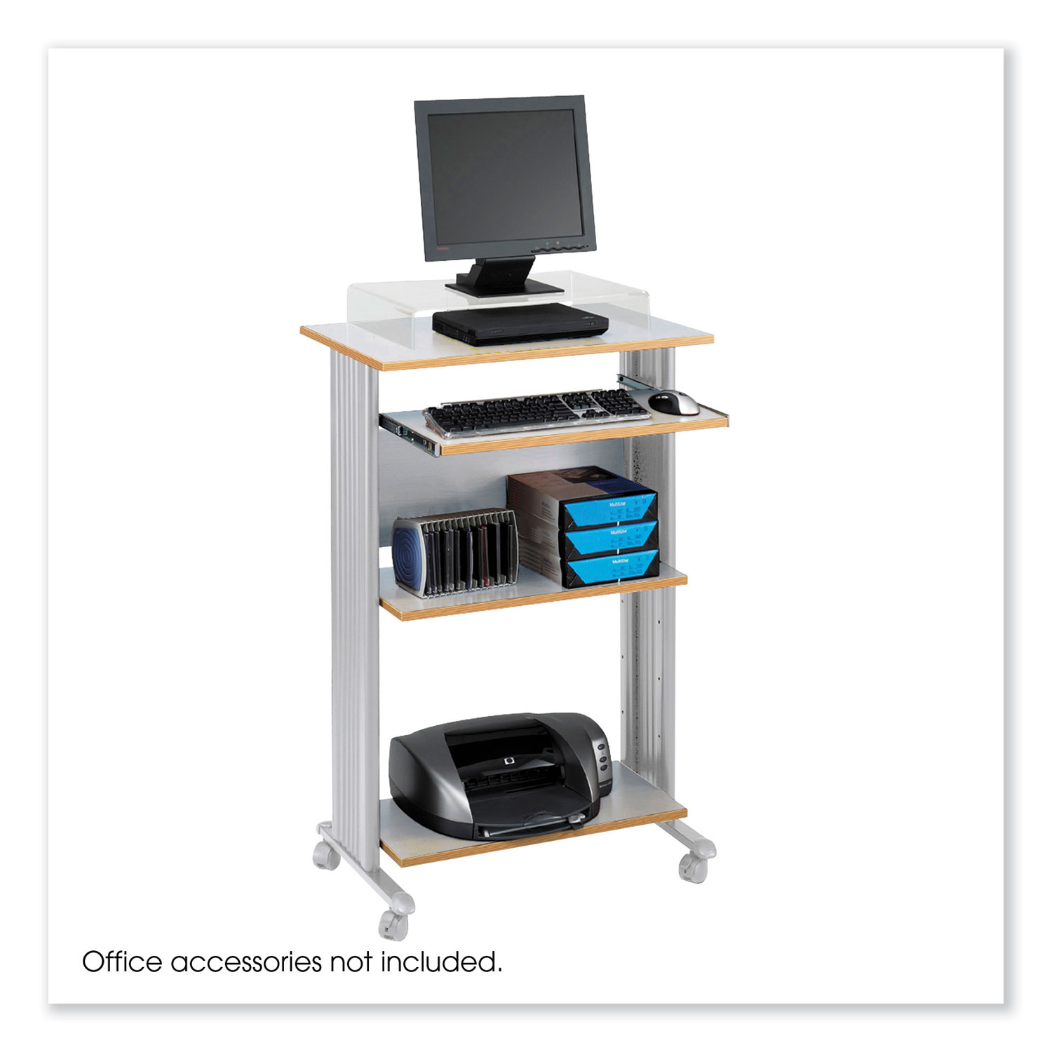 The Muv™ Stand-Up Desk features a tall workstation and durable powder-coated steel frame. The stand-up desk is furnished with a 24.75" width adjustable printer tray and a keyboard panel that extends in 1" increments. Exceptional cable management with molded modesty panels on each side hide cords. A mobile stand-up desk solution with four casters (two locking). All work surfaces and shelves made of durable 0.75" melamine laminate. Series Name: Safco® Muv™; Worksurface/Base Color: Gray; Color Family: Gray; Worksurface Shape: Rectangular.