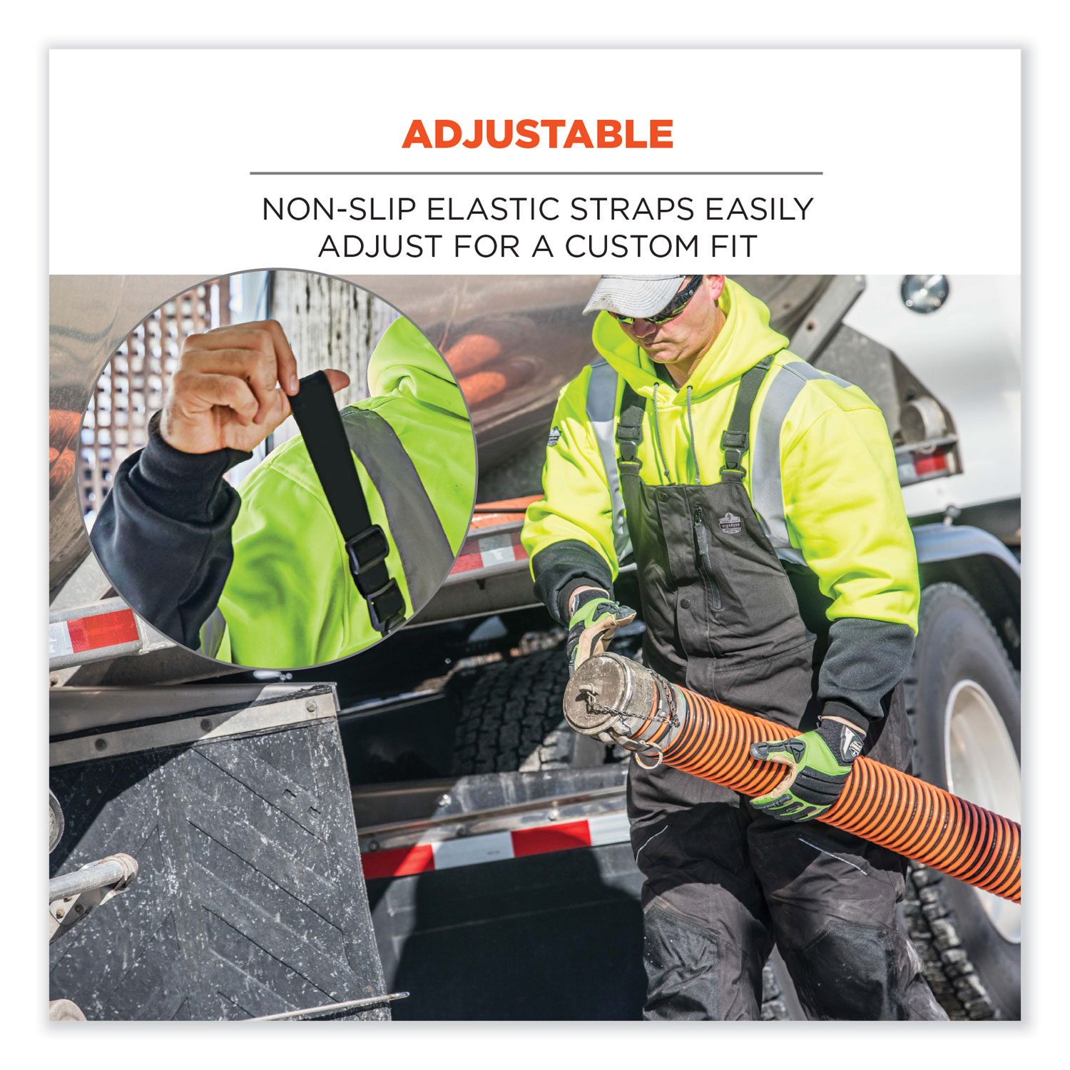 The N-Ferno 6472 Insulated Bib Overalls are designed to be worn over work pants for warmth and durability in cold environments. The 300D polyester oxford with breathable water-repellent coating protects from the elements, while the thermal insulation and quilted lining keeps workers comfortably warm. These black winter work bibs hide dirt and feature reinforced knee patches for long-lasting wear. A heavy-duty front zipper closure, comfortable elastic-stretch sides and full-length zippered pant legs make for easy on/off without removing boots. Adjustable non-slip elastic straps allow workers to get the perfect fit. For convenient storage, these work bibs have one chest pocket and two side pockets. Reflective accents keep workers safe and seen. These insulated bib overalls are ideal for those who work in cold environments where hi-vis is not required, including refrigeration, transportation, airlines or agriculture. Apparel Type: Thermal Bibs; Material(s): Polyester; Color(s): Black; Color Family: Black.