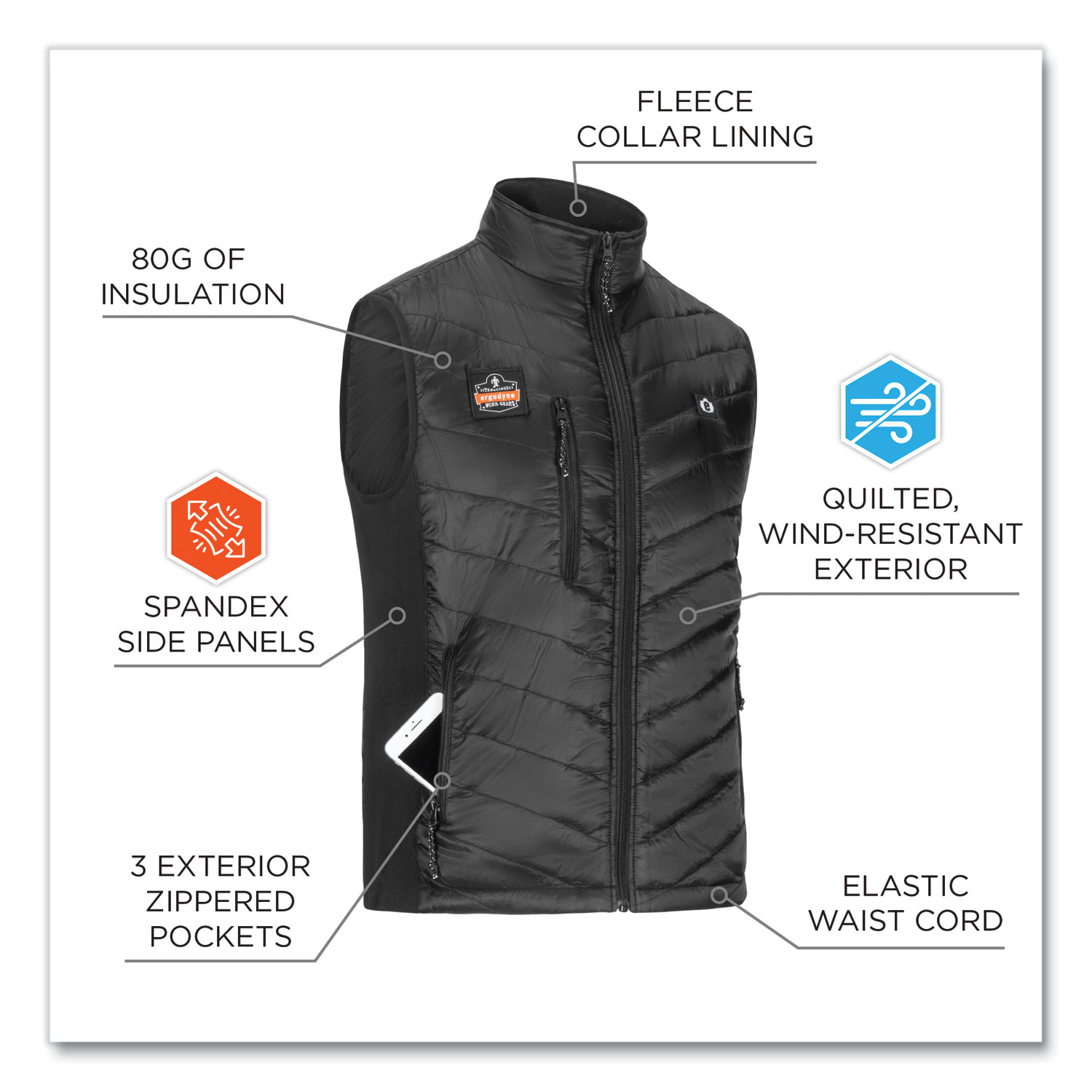 The N-Ferno 6495 Rechargeable Heated Vest features a battery power bank (7.2 V/5,000 mAh) and four heating zones around the neck collar, mid-back, and left and right chest for all-day warmth in cold to extreme conditions. This heated vest features 80 g of insulation and serves as a low-bulk mid-layer option that traps body heat and fits comfortably under bulky winter jackets and gear. A wind-resistant polyester performance exterior provides protection from the elements and a fleece lining around the collar adds warmth for all-day use. The heated vest offers warmth without compromised mobility, featuring stretchable spandex blend on the sides for a comfortable fit. Unlike typical boxy and bulky winter gear, this lightweight vest is designed for a more athletic, snug fit to keep the heating zones close to the body for maximum warmth. This vest features an elastic bungee waist for a snug and adjustable fit that keeps cold air out and a zippered closure makes for easy on and off. Apparel Type: Vest; Materials: Fleece; Polyester; Color(s): Black; Color Family: Black.