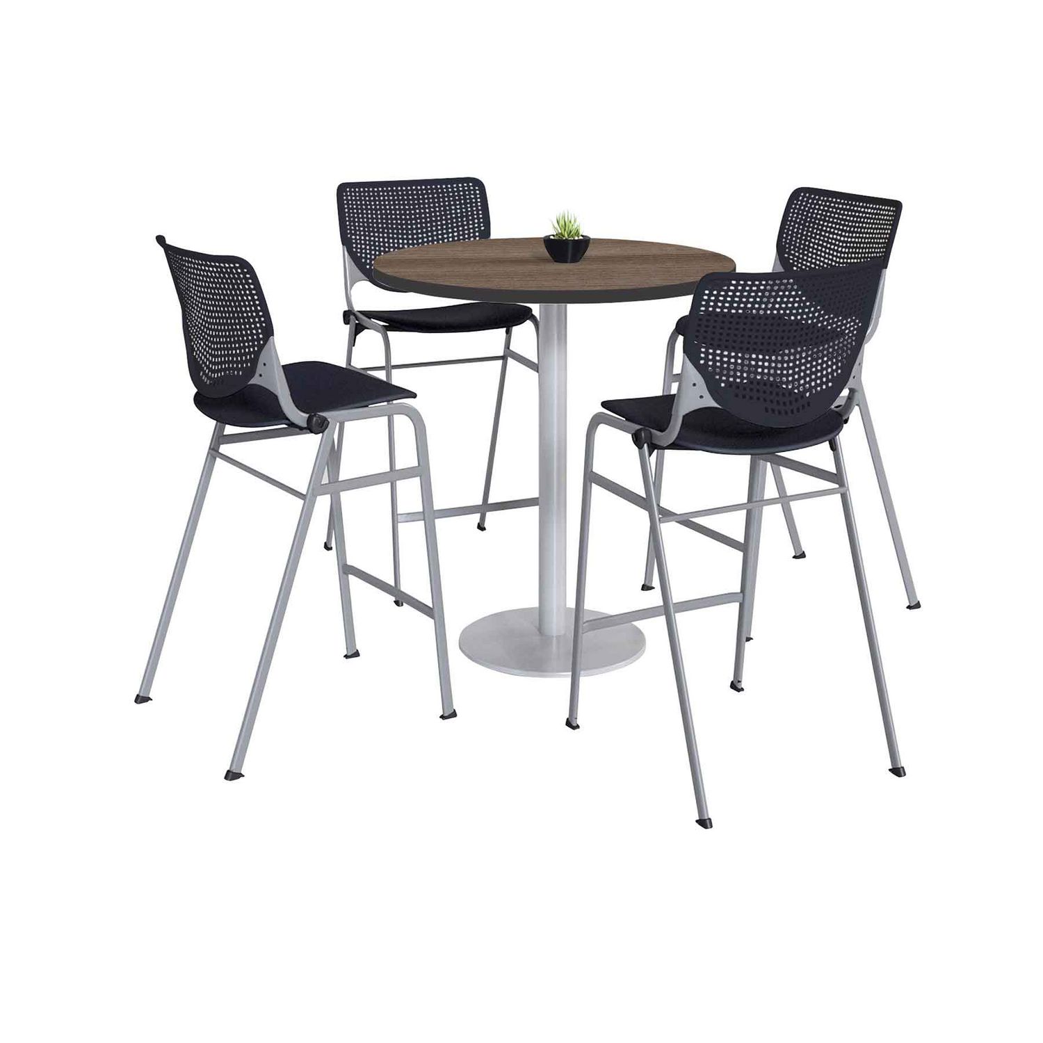 Contemporary and comfortable breakroom/cafeteria furniture. Table and 4 barstool set. This pedestal table has a 1.25" thick high-pressure laminate top that's durable and easy to clean. The top has an attractive edge that won't crack or peel. The solid cast iron round base has leveling glides to prevent the table from wobbling on uneven floors. The steel column has a 3" diameter and is made of 16-gauge steel. The top and base are all shipped in one box. Easy to assemble. The barstool has an easy to clean polypropylene seat and back. The ergonomic perforated back allows for enhanced circulation, while the radius conforms to your back for maximum comfort. The chair offers a contoured extra wide seat pan and a 400-lb weight capacity to provide comfort and accommodate all sizes. The oval frame is made of 15-gauge steel with silver powder-coat. The 2300 is one of most complete stack chairs on the market. It's just plain.... KOOL. Tables shipped unassembled. Chairs shipped assembled. Top Color: Studio Teak; Color Family: Teak; Base Color: Silver; Top Shape: Round.