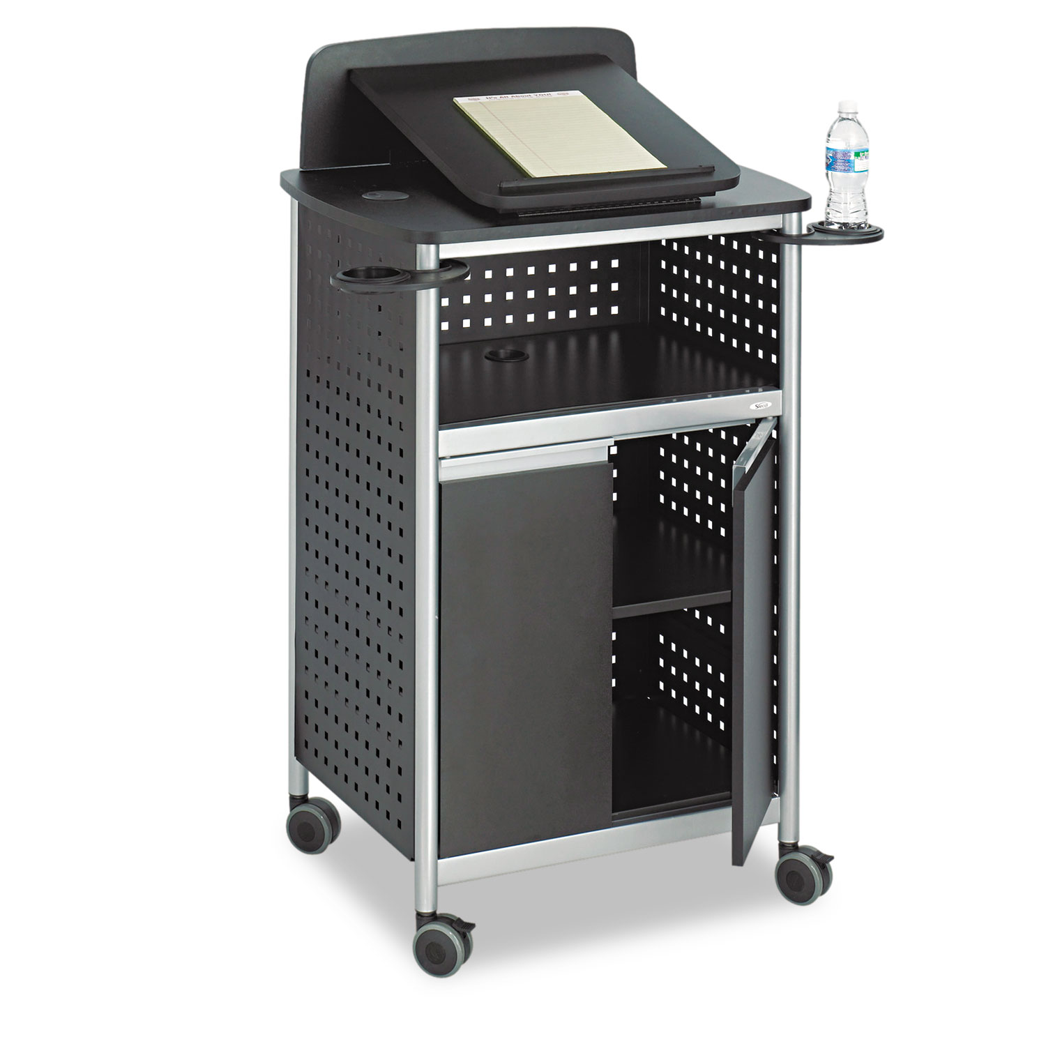 Multipurpose lectern travels easily and adapts to a variety of situations. Fold-down platform offers a flat surface for media needs and easy visibility. Lectern features large open storage area underneath presentation surface, plus interior shelf with double doors. Shelves adjust in 1” increments. Two swivel cup holders. Powder-coated steel construction with durable laminate shelves. Mobile on four casters; two lock for added stability.