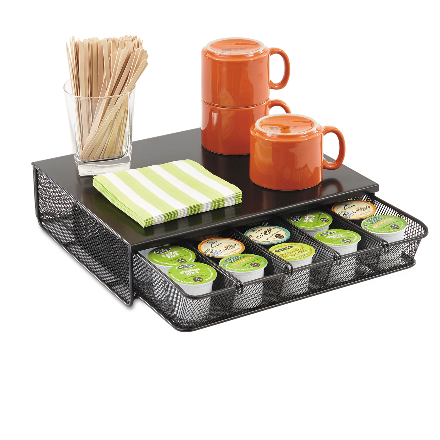 Easily organize breakroom supplies, coffee condiments or single-serve coffee pods.