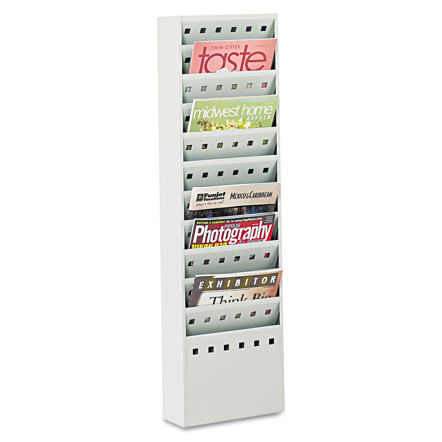 Mounts to wall or can be used with optional gray base, Safco® Steel Base for Magazine Rack (sold separately).