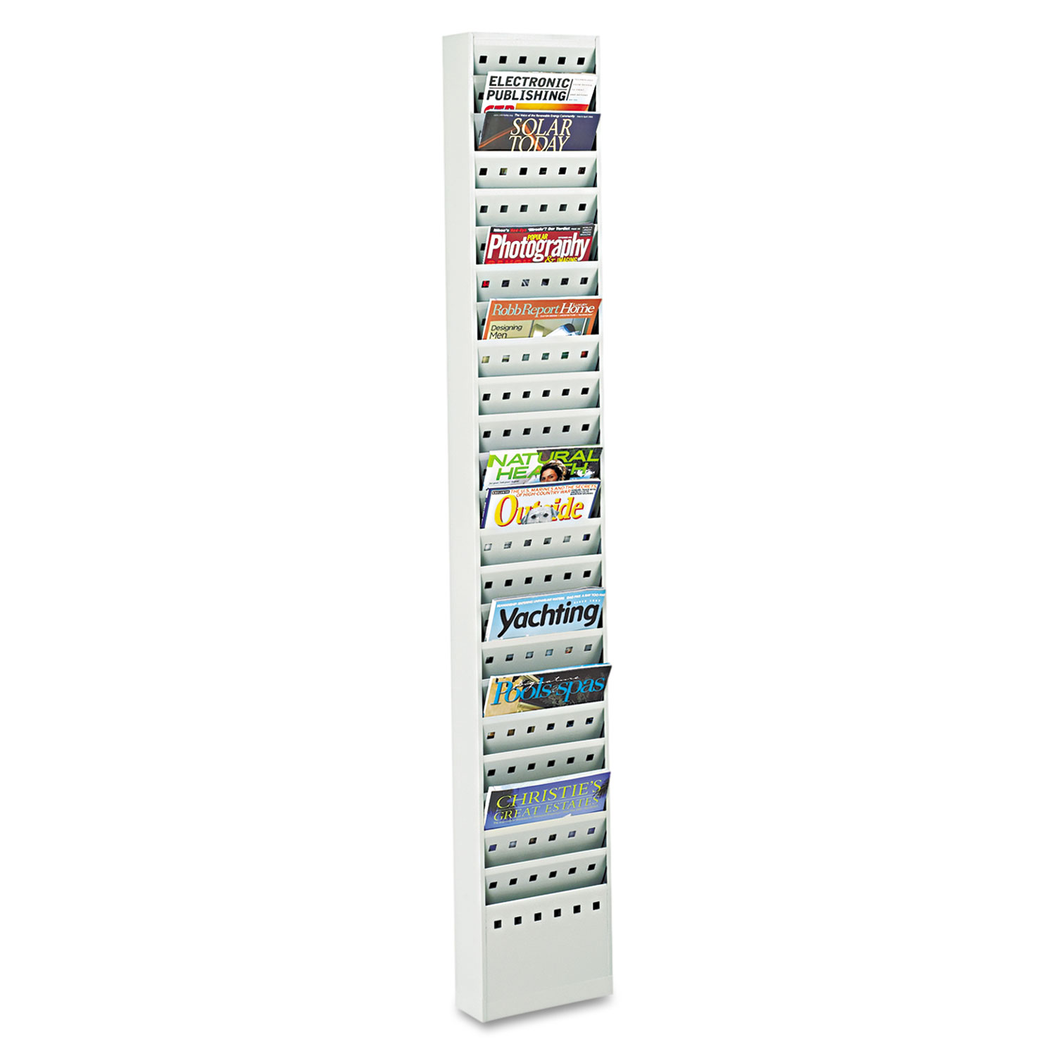 Solid steel with an attractive design on the pockets. Mounts to wall or can be used with optional gray base, Safco® Steel Base for Magazine Rack (sold separately). Durable textured powder coat finish.