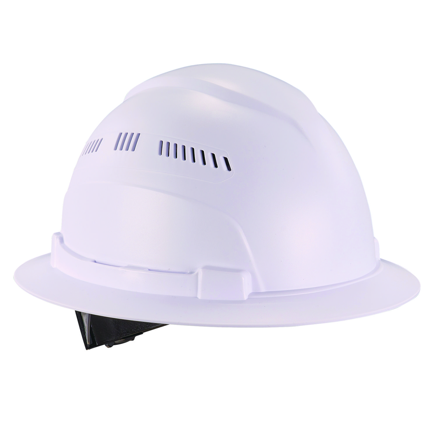 The Skullerz 8968 Class C Vented Hard Hat with 6-Point suspension provides lightweight yet durable protection to shield the top of the head from falling objects or bumping into stationary objects. This vented hard hat features a lightweight HDPE plastic shell for comfort without comprised protection. Compared to 4-Point suspension systems, the 6-Point suspension better disperses the force of an impact. For a custom and secure fit, it offers more adjustment points (36 in total) and pivots up and down to clear bandana or ponytail knots. This full brim style helps keeps rain away from the eyes and provides extra protection against falling or flying debris. It also offers all-around coverage from the sun. The ventilated, open frame design and always-open venting makes for a cooler hard hat by releasing heat buildup and allowing air to circulate—reducing perspiration in hot and humid working environments. Hat sizes 6.5-8.25 (head circumference: 21"-26"). Hard Hat Style: Full Brim; Material(s): High-Density Polyethylene (HDPE). Adjusting Method: Rachet; Suspension: 6-Point.