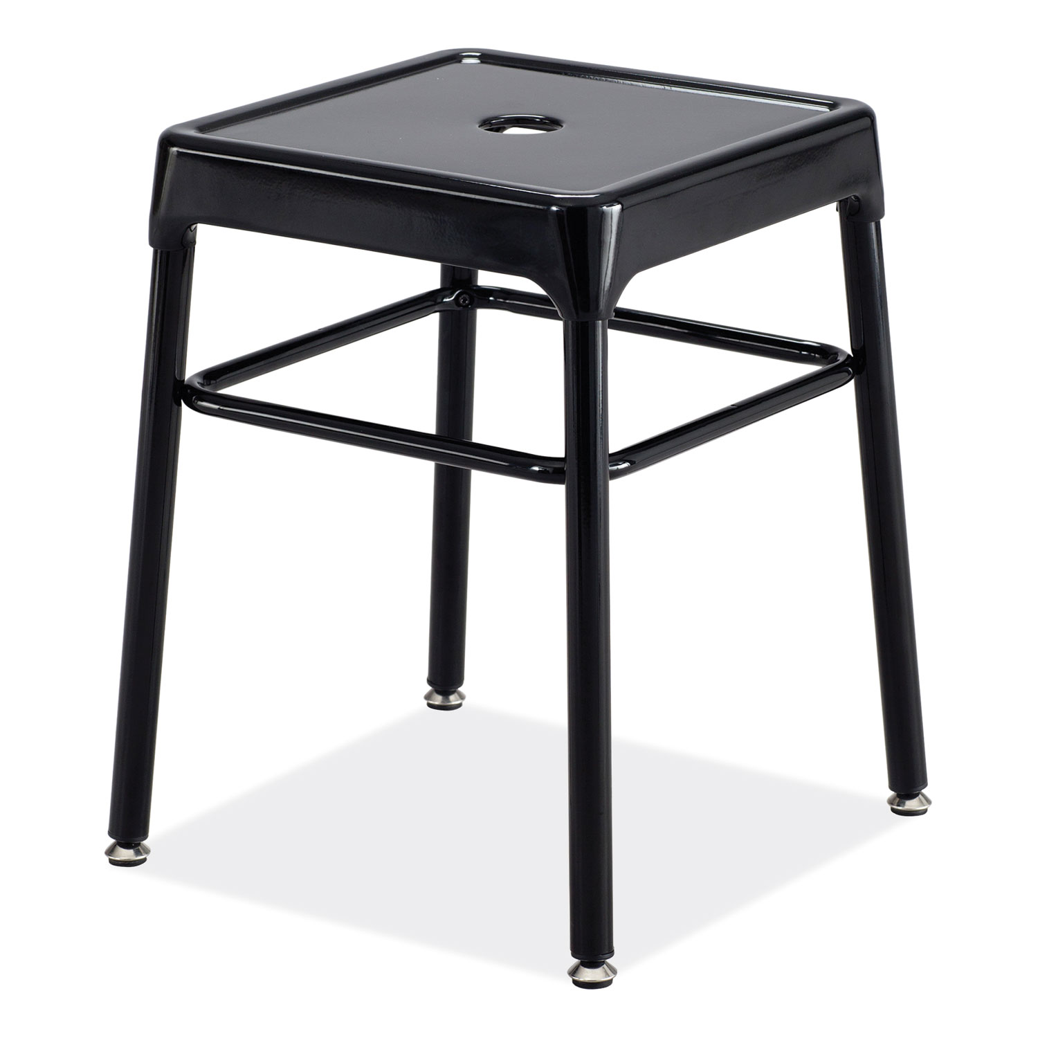 The Safco® Steel Guest Stool is a sturdy, all steel stool that is great for use in a variety of spaces. The guest-height stool is perfectly suited for use in breakrooms, open floor plans, personal workspaces, lobbies and more. The easy-to-clean powder coat finish is durable and chip-resistant for a long-lasting seating option. These stools include choice of nylon leg caps or leveling glides to protect floors from scratches or scuffs. The hole in the top of the seat allows the chair to be easily grabbed and carried to allow for portability between spaces. Recommended Application Area(s): Breakroom & Foodservice; Seat Color: Black; Color Family: Black; Arms Included: No.