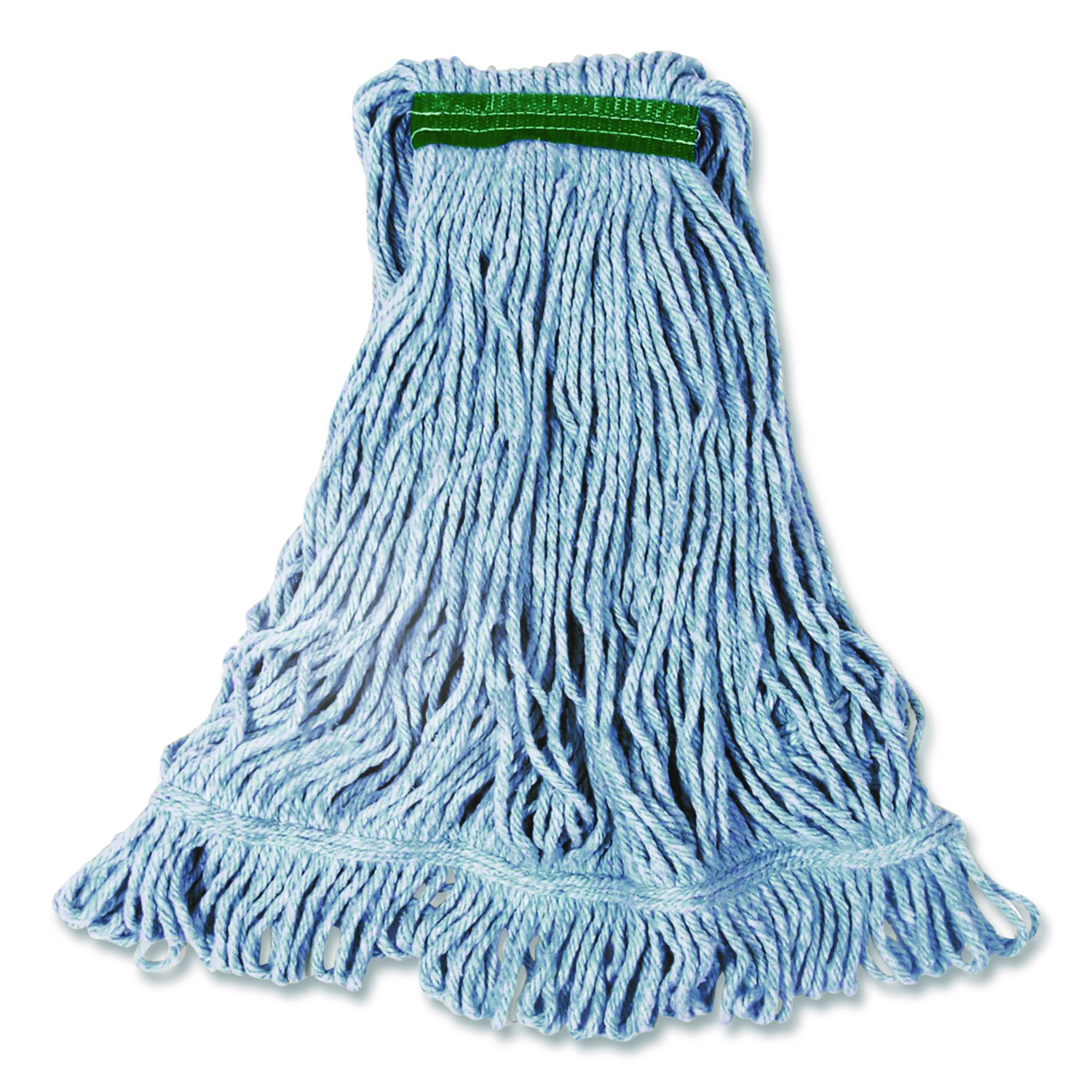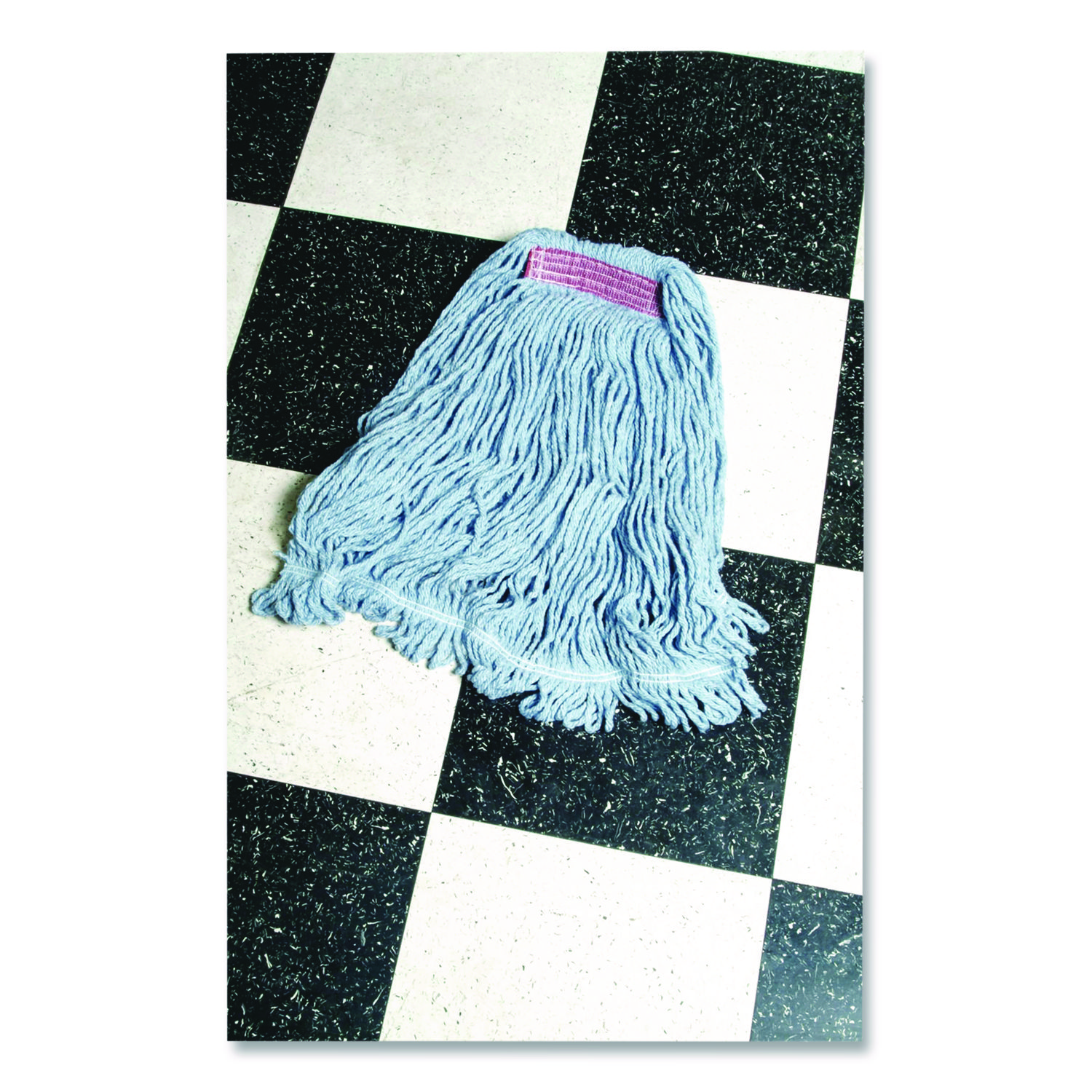 The Rubbermaid Commercial Super Stitch Blend Mop has a blend of 4-ply cotton and synthetic fibers for higher absorbency and more launderings than cotton mops, and has looped ends and a yarn tailband to reduce tangling and fraying for improved performance. The synthetic mesh headband resists moisture retention so the mop head can dry between uses. Color-coded to help minimize cross-contamination. These mop heads are suitable for use in commercial and industrial applications. Mop Head Type: Wet Mop; Application: Floor Maintenance; Mop Head Style: Looped End; Mop Head Color: Blue.